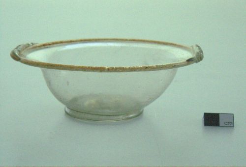 labbro esoverso ribattuto all'esterno a cordoncino, su cui si impostano due pseudoansette lavorate a caldo a pizzicature parallele, corpo troncoconico, piede ad anello applicato; vetro incolore, trasparente