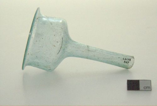 labbro esoverso arrotondato, corpo cilindrico, fondo conformato a canale a sezione circolare; vetro verdeazzurro, trasparente; molte bolle per difetto di fabbricazione
