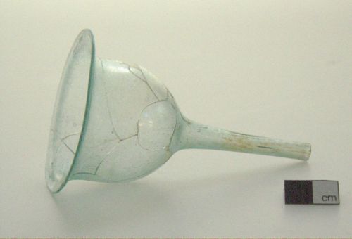 labbro esoverso appiattito, corpo campaniforme, fondo conformato a canale a sezione circolare; vetro verde, trasparente