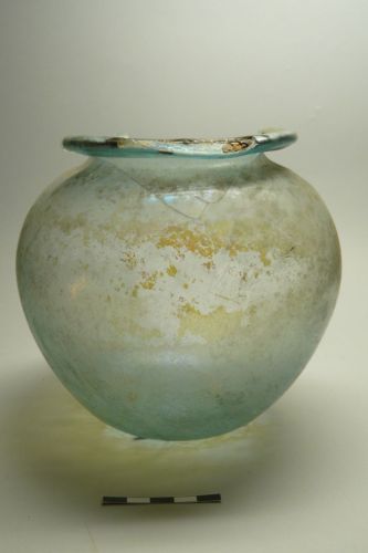 labbro ripiegato all'esterno e appiattito a tesa, brevissimo collo, spalla arrotondata, corpo globulare, fondo leggermente concavo; vetro verdeazzurro, trasparente