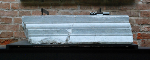 Base modanata, dall'alto: listello, fascia, listello (lisci); toro (a gradina), listello (liscio), fascia (a gradina), listello (liscio), gola rovescia (a gradina). Sul retro, lisciata.