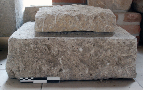 Urna a cassetta quadrangolare con coperchio; la cassetta ha il bordo rilevato a listello piatto e a profilo diritto, levigata in alto e lavorata a scalpello su tutti e quattro i lati. Tracce di scalpello anche sul coperchio.