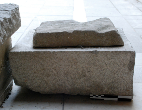 Urna quadrangolare a cassetta con coperchio a base quadrangolare. Rifinita a gradina ai lati del corpo; coperchio sbozzato.