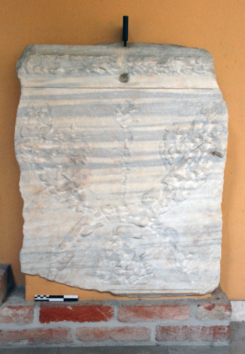 Fianco di sarcofago decorato a festoni, con cornucopie di frutta intrecciate ai lati di un tirso su foglia di vite, scalpellati. La facciata frontale è un gran parte scalpellata e presenta un foro circolare. Il bordo superiore è rilevato, rifinito a gradina; il retro levigato.