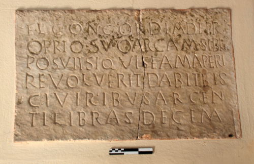 - ISCRIZIONI sul fronte della cassa - Fl(avia) Concordia de pr- / -oprio suo arcam sibi / posuit si quis eam aperi- / -re voluerit dabit fis- / -ci viribus argen- / -ti libras decem - lettere capitali - a incisione - latino
