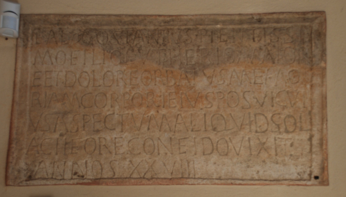 - ISCRIZIONI sul fronte della cassa - Fl(avius) Costantivs pientissi- / -mo filio Eutherio amission- / -e et dolore orbatus memo- / -riam corpori eius posui(t) cui- / -us aspectum aliquid sol- / -acii fore confido vixit / annos XXVIII - lettere capitali - a incisione - latino