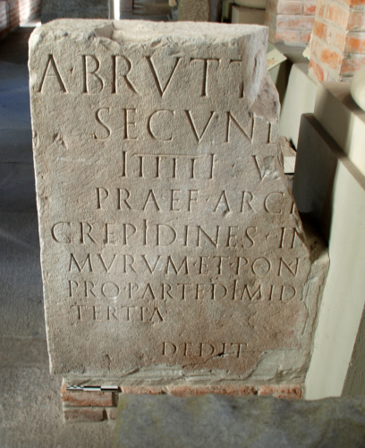 - ISCRIZIONI sullo specchio epigrafico - A(ulus) Bruttius A(uli) l(ibertus) / Secundus / (sex)vir / praef(ectus) archit(ectus ?) / crepidines inter / murum et pontem / pro parte dimidia et / tertia / dedit - lettere capitali - a incisione - latino