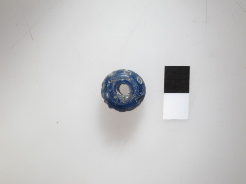 Perla tondeggiante medio-grande in pasta vitrea azzurra con decorazione a zig-zag saltata. Tipo D Gambacurta, G. 1987: "perle con decorazione a zig-zag".