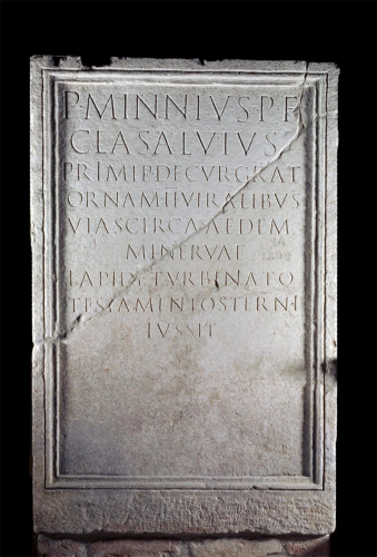 - ISCRIZIONI all'interno dello specchio epigrafico - P(ublius) Minnius P(ubli) f(ilius) / Cla(udia tribu) Salvius / primip(ilus) decur(io) grat(uito) / ornam(entis) (duo)viralibus / vias circa aedem / Minervae / lapide turbinato / testamento sterni / iussit - lettere capitali - a incisione - latino