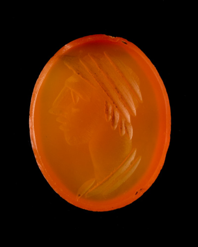 Corniola di forma ovale piana/convessa con incisa una testa maschile di profilo a sinistra, con copricapo a calotta, decorato da linee parallele, da cui fuoriescono i capelli, resi con quattro brevi e spessi tratti verticali; collo e attacco del busto, con indicato lo scollo della veste. Da notare l'occhio di grandi dimensioni, con fortemente marcata l'arcata sopraccigliare; il naso allungato (con il tratto inferiore ben sottolineato); le labbra rese tramite due tratti diagonali paralleli abbastanza sottili.