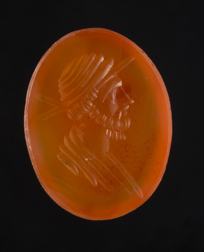 Corniola di forma ovale piana/piana con incisa una testa maschile barbata di profilo a destra. La raffigurazione comprende parte del busto, panneggiato con scollo a punta. Da notare il tipo particolare di copricapo a solcature concentriche, con due elementi davanti e due dietro. Il profilo è caratterizzato dal naso diritto e l'occhio grande. I capelli che fuoriescono dal copricapo sono resi a fitti e brevi tratti paralleli; caratteristica la raffigurazione della barba con doppia fila di ciocche (quella inferiore a piccoli ciuffi).