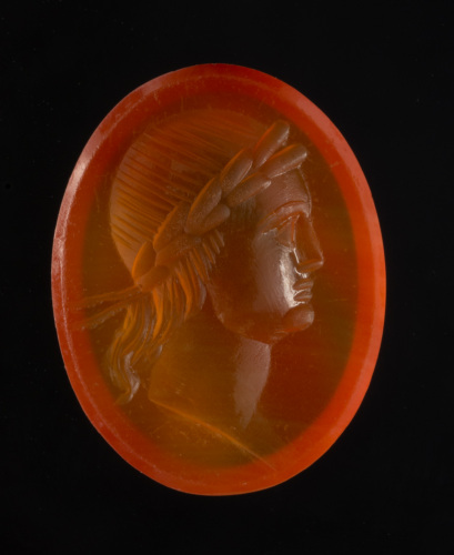 Corniola di forma ovale piana/piana con incisa una testa maschile di profilo a destra, con corona d'alloro annodata sulla nuca, dove sono raffigurati i due nastri in modo rigido e tesi all'indietro; fino all'attacco del busto, segnato da una linea in diagonale. I capelli sulla nuca sono indicati mediante sottili striature parallele e regolari, poi scendono in lunghe ciocche sul collo.