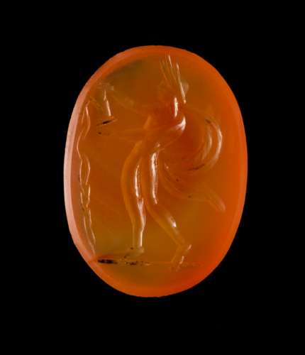 Corniola di forma ovale piana/convessa con incisa scena di libagione. Una figura maschile con le braccia tese in avanti regge una brocca da cui fuoriesce una lunga colata di liquido; sulla schiena si gonfia un mantello fissato in vita, con un lembo svolazzante verso il basso; da notare la strana acconciatura, irta sulla fronte (forse una corona vegetale?); linea del suolo oltre la quale sporge uno dei piedi.