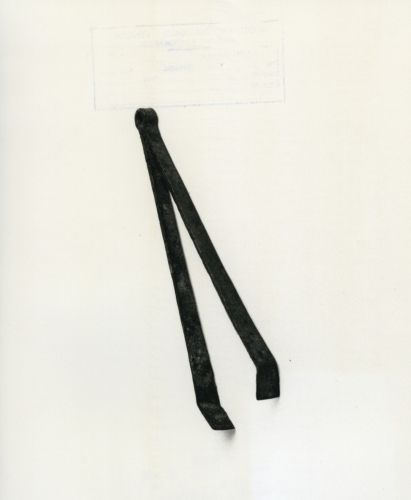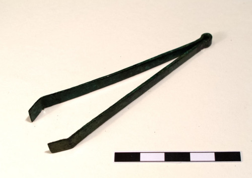 Volsella, pinzetta da toletta formate da un'unica lamina ripiegata in due, com l'apice conformato e piegato ad anello (probabilmente per essere agganciato). Le estremità sono incurvate/piegate a 45° per permettere una chiusura millimetrica.