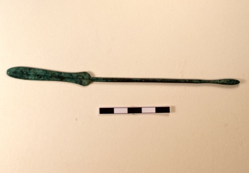 Sonda con stelo a sezione circolare, terminante ad oliva da un lato e con una spatola lanceolata, a foglia, divsa in due da una costolatura centrale, dal lato opposto. Prima dell'oliva, restringimento nella diametro dello specillo.