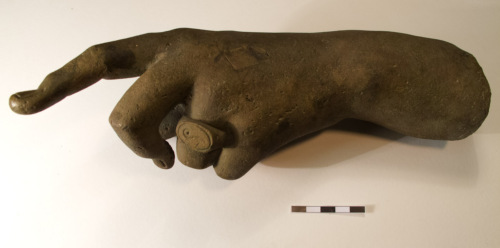Mano sinistra in bronzo raffigurata nel gesto di benedire. Il pollice el'indice sono tesi, il medio e semiteso, mentre anulare e mignolo sono ripiegati verso il palmo della mano. All'anulare è infilato un anello ovale con incisione simbolica, riproducente un occhio.