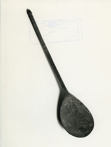 Cucchiaio in lega di rame, con manico a sezione rombo-quadrata, decorato da una pigna finale nellimmanicatura, preceduta da un anellino.