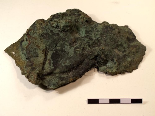 Frammento di statua (?)in bronzo, probabilmente a grandezza naturale. E'presente una decorazione superficiale poco leggibile, forse (ma difficile provarlo) corrispondente alla criniera o al vello di un animale. La qualità del frammento non permette nessuna ulteriore identificazione, se non la possibiliotà si tratti di una parte di un grande statua o gruppo scultoreo.