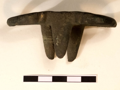 Anello gemino tricuspidato in bronzo, formato da due elementi anulari cilindrici, raccordati da un corpo mediano sormontato da tre cuspidi: una più larga, a base triangolare, e due più sottili affiancate, di forma piramidale. Gli anelli presentano deboli ispessimenti rettangolari sulla parte frontale.