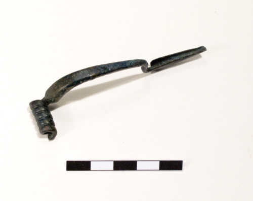 Fibula ad arco trapezoidale, rivestito, con staffa lunga. Si tratta di un tipo di fibula di cui manca il rivestimente dell'arco (realizzato in osso, o in ambra o in bronzo) che doveva assumere un aspetto simile alle fibule a sanguisuga. Caratterizzata da una staffa piuttosto allungata, la fibula ha un ingrossamento sulla verga a sezione trapezoidale che serviva a fermare il rivestimento.