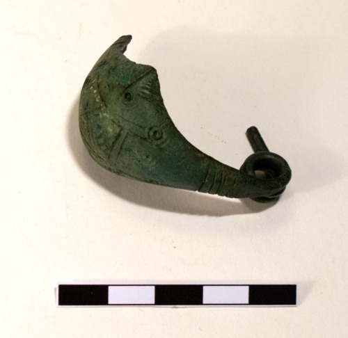 Fibula a navicella, a losanga con pannello longitudinale, decorato a incisioni, con un rettangolo centrale a graticcio, e incisioni parallele. I bordi del pannello sono segnati da occhi circolari incisi. Gli angoli delle losanghe sono incisi a spina si pesce.