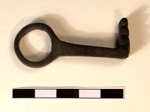 Chiave a scorrimento, semplice, con anello a fascia, e stelo a sezione rettangolare che si rastrema verso i denti. I denti, montati su una verga paralella all'anello, sono tre.