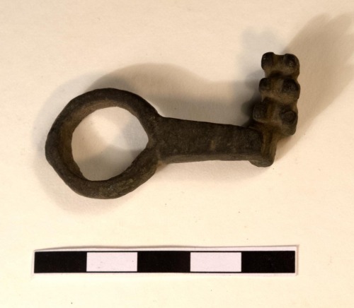 Chiave a scorrimento, semplice, con anello a fascia, e stelo a sezione rettangolare che si rastrema verso i denti. I denti, montati su una verga paralella all'anello, sono sei su tre file pseudoparalelle.