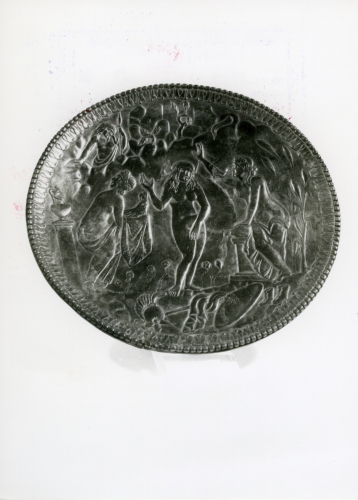 Il piatto è realizzato in argento fuso, poi lavorato a cesello e bulino e presenta su di una faccia una complessa scena figurata, entro una cornice a kymation e perline che decora il bordo. Sul fondo esterno, liscio per levigatura, è applicata tramite saldatura una base cilindrica ad anello, al cui interno compare un'iscrizione a puntini incisi. L'iscrizione presenta dei segni di problematica interpretazione: si tratta comunque di un'iscrizione ponderale, indicante probabilmente il peso complessivo dell'oggetto, a garanzia dell'alta quantità di metallo prezioso adoperato. Il piatto appartiene ad un gruppo di grandi piatti decorati con scene mitologiche o scene di genere nilotico o idillico-bucolico. Si tratta di manufatti di officine orientali (Costantinopoli, Alessandria) o occidentali (Ravenna, Roma), non di rado legati ad una committenza se non direttamente imperiale, certamente gravitante nell'ambito della corte imperiale stessa. L'alto valore artistico e il tenore dell'argento, di norma intorno al 95 %, li rendeva oggetti assai ricercati anche dall'aristocrazia barbarica.