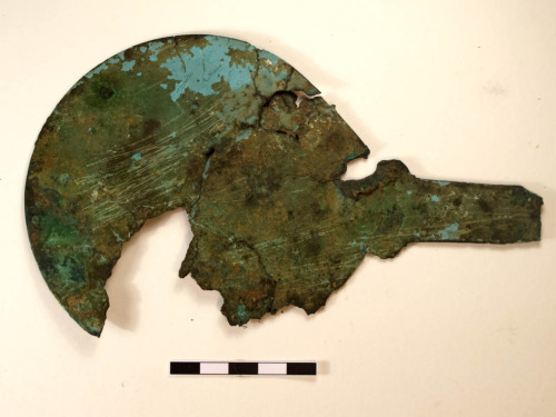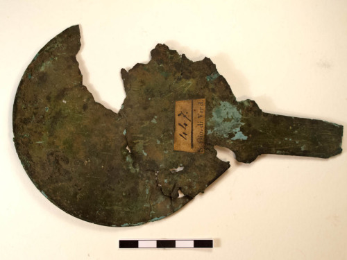Specchio di forma circolare, sottile in bronzo, non decorato. Dalla stessa lamina del disco è ricavato un rettangolo per l'immanicatura.