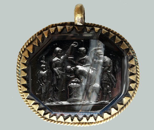 Pendente in argento dorato, con bordo a cordoncino e cornice dentata, con anello per la sospensione, in cui è montato un intaglio di forma ottagonale. Nella gemma è raffigurata una complessa scena di sacrificio che si svolge attorno ad un'ara cilindrica, ornata da festoni, a cui partecipano cinque personaggi maschili che reggono diversi attributi (fiaccola, piatto di frutta, corona, grappolo d'uva), probabilmente offerte, e accompagnano l'animale sacrificale, un capro.