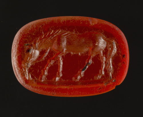 Raffigurazione distribuita in senso orizzontale. Cavallo di profilo, con la testa abbassata in atto di pascolare. Da notare sotto il muso il ciuffo d'erba e le briglie che pendono dal collo. Lunga linea del suolo