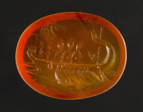 Su una corniola ovale è raffigurata una nave ad alta prora ricurva con fila di remi. Sulla tolda sono raffigurati tre guerrieri con elmo; di fronte a loro due insegne legionarie, sulla prima delle quali si vede l'aquila, raffigurata di prospetto ad ali spiegate, con il capo rivolto verso destra; sotto lo scafo sono indicate le onde del mare, a piccoli tratti ricurvi. La raffigurazione è disposta in senso orizzontale. L'incisione di ottima fattura è caratterizzata dall'impiego di piccoli globuli, che aiutano a fissare la datazione nella seconda metà del I sec. a.C.