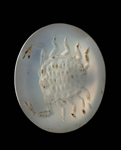 Nel calcedonio è rappresentato, in senso orizzontale, un granchio visto dall'alto, il cui dorso è caratterizzato da cinque file di piccoli e spessi trattini paralleli. Forse la raffigurazione va intesa in senso zodiacale.
