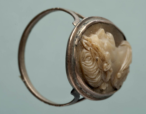 In un cammeo, legato in un anello d'oro, è raffigurato un busto maschile, tagliato al di sotto delle spalle, con corona d'alloro, di profilo verso destra. Il volto è caratterizzato dal naso importante e il mento molto pronunciato; da notare le rughe all'angolo dell'occhio, dall'arcata sopraccigliare ben marcata, e sulle guance. I capelli sono disposti a ciocche ricurve sulla nuca, al di sopra della corona d'alloro incisa, e con piccoli riccioli sulla fronte; un grande ricciolo si arrotola davanti all'orecchio scoperto. Sul busto è raffigurato il paludamentum, fermato da una fibula ritonda, che ricopre la lorica, di cui si notano gli pteryges sulla spalla. Gli elementi della raffigurazione rimandano all'iconografia imperiale antica.