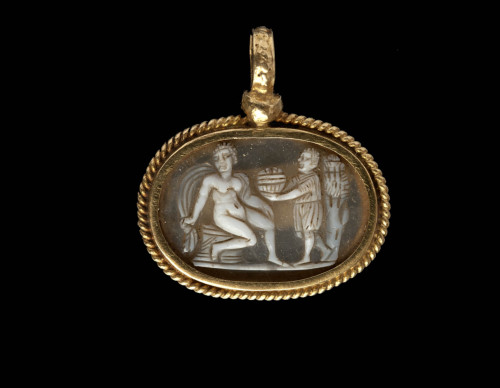 Cammeo con montatura a pendaglio: la gemma è legata in un castone d'argento dorato con bordo a catena e anello per la sospensione in alto. La raffigurazione, disposta in senso orizzontale, si imposta su una lunga linea del suolo: a sinistra, una figura femminile nuda, di tre-quarti, siede su un'ara quadrangolare, la gamba destra piegata in primo piano, la sinistra allungata, con il piede posato sulla linea del suolo. Col braccio destro teso, posato sull'altare, trattiene il mantello che si gonfia ad arco dietro la sua schiena, un lembo edl quale gira attrono al braccio sinistro. Di fronte a lei, sulla destra, è raffigurato un personaggio maschile, in veste corta alle ginocchia, stante di profilo, le braccia allungate in atto di offrire un cesto; la gamba sinistra, portante, è diritta, mentre la destra è piegata all'indietro. La composizione sulla destra è chiusa da un albero, assai stilizzato. L'intaglio è schematico e lineare; la resa dei volti grossolana. Il personaggio femminile può essere interpretato come Venere.
