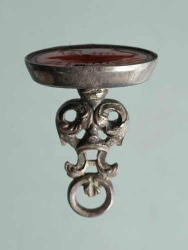 La gemma è incastonata in un sigillo d'argento, con una presa a foglie d'acanto, desinente in un cerchietto. Nella corniola, la raffigurazione si dispone in senso orizzontale: in una nave di profilo verso sinistra, caratterizzata da un alto aplustre ricurvo, quattro personaggi molto stilizzati sono raffigurati sul ponte, uno è in coperta al comando; i remi sono in azione, mentre nella parte inferiore dell'ovale sono rappresentate le onde del mare, rese con sottili solchi ondulati.