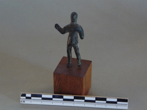 Bronzetto di guerriero stante, testa ha profilo subcircolare, è priva dei tratti del volto ad eccezione della bocca. Il corpo è trattato in maniera sommaria, il braccio destro ha terminazione appiattita. Il resto del corpo risulta tozzo e i genitali sono accentuati.