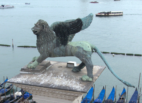 - NOTIZIE STORICO CRITICHE La più antica menzione è del 1293, quando però si parla già di restauri; e poiché la colonna sulla quale si trova fu portata a Venezia nel 1172, tra queste due date (metà del XIII sec. circa) va posta la collocazione del leone. Fu asportato da Napoleone che lo collocò a Parigi nella Place des Invalides, e tornò a Venezia nel 1815; in questa occasione cadde, si ruppe in molti pezzi e fu restaurato dallo scultore Bartolomeo Ferrari, il quale lo ricompose con orditure di ferro e borchie a testa quadrata. Fu rimosso nel 1892 per una completa ispezione da G. Boni e poi non fu più toccato fino al 1940, quando fu posto al sicuro in occasione della seconda guerra mondiale. Le integrazioni del Ferrari (coda, ali, parte delle zampe e un ciuffo sulla testa), sono chiaramente riconoscibili; il libro sotto le zampe fu rifatto in piombo, ma la figura, specie la testa il petto e i fianchi, è sostanzialmente originale e in buone condizioni. Un serio elemento di dubbio è costituito dalle ali: le attuali si devono senz'altro al restauro del Ferrari, che ha sostituito quelle medievali, ma non è certo se la bestia fosse originariamente alata, prima di essere trasformata nel simbolo di S. Marco. Fu creduto romanico, assiro, indiano, cinese e sassanide. Un punto fermo è dato dal fatto che esso è certo anteriore alla metà del XIII sec. (la più bassa data possibile), ma per ragioni stilistiche e tecniche non può certo essere considerato opera medievale italiana; c'è ragione di credere invece che, come altre antichità veneziane, provenga da Costantinopoli o dal Levante. L'ipotesi che in origine si trattasse di una Chimera è molto verosimile.