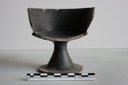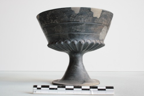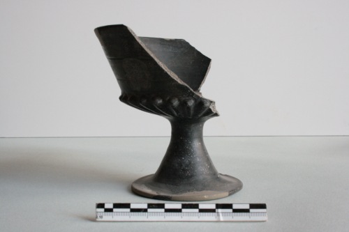 Calice in stato frammentario, di cui se ne conserva solo metà, in bucchero pesante grigio scurissimo con supeficie nero opaco. La coppa è suddivisa in due zone da due scanalature orizzontali: nella zona sotto l'orlo è presente un motivo a ventagli aperti incisi a rotella dentellata; nella zona inferiore, invece, è decorata a ventagli chiusi e distesi pure incisi a rotella. La parte inferiore della coppa è decorata da profonde bacellature, forma di derivazione di esemplari in metallo. Lo stelo è liscio. Sulla superficie sono presenti incrostazioni diffuse terrose e biancastre.