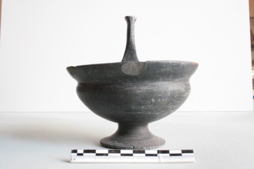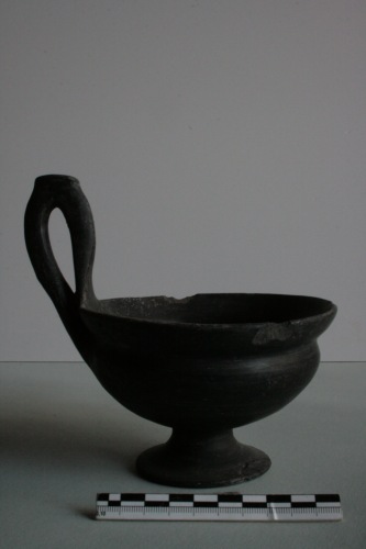 Kyathos con coppa emisferica e ansa sopraelevata in bucchero pesante grigio scurissimo e superficie nero opaco. La coppa presenta labbro distinto, ansa sopraelevata con sommità schiacciata a bottone e munita di ponticello di rinforzo presso il labbro e piede troncoconico cavo. Sul corpo, sotto l'attacco dell'ansa, vi sono due fasci di sottile righe orizzontali incise. L'orlo è sbrecciato in alcuni punti. Questo tipo di kyathos è frequente soprattutto nel territorio di Vulci.