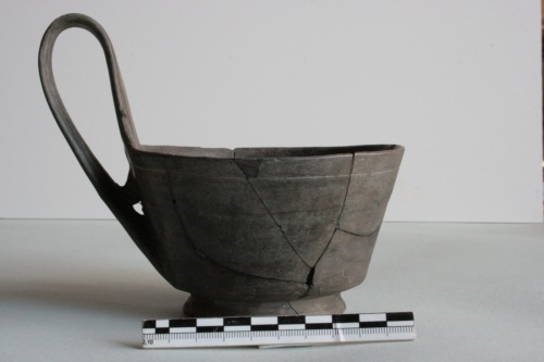 Kyathos in bucchero sottile con superficie color nero-fumo. La coppa è profonda con la parete leggermente svasata e il piede a tondello diviso dal corpo da strozzatura profonda. L'ansa è a nastro sopraelevata con ponticello mediano. Sotto l'orlo è presente una linea orizzontale incisa. Il vaso è ricomposto da più frammenti, manca del piede e di alcuni frammenti del corpo. Si tratta di un kyathos estremamente essenziale nella forma, tra gli ultimi esiti del tipo, e che trova confronti con esemplari provenienti da necropoli ceretane.