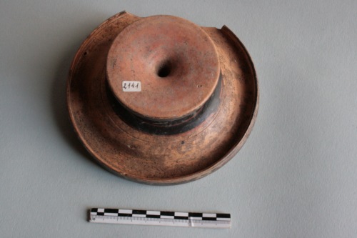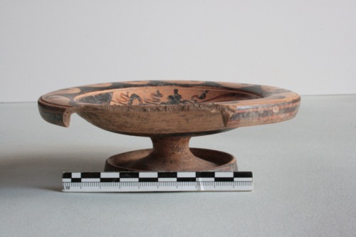 Piatto ceretano in argilla giallo-rosata con ingubbiatura più scura e vernice nera opaca. Il piatto è composto da un orlo piatto all'esterno, una coppa poco profonda,un piccolo stelo e un piede ad alto orlo ad anello. Il fondo è risparmiato; sul bordo è presente una decorazione un motivo ad onda; all'interno della coppa un profilo femminile rivolto a sinistra con corona radiata, acconciatura a reticella da cui fuoriescono ciocche di capelli a serpentello, orecchino a disco con tre pendenti ad ingrossamento centrale e terminale, collana ad un filo di grossi grani, occhio ben marcato e aperto e ciglia superiori sottolineate da un punto, un punto sottolinea anche la radice del naso, dritto e pronunciato, mento arrotondato e sfuggente. I dettagli sono resi con l'uso di una vernice più diluita. Per le caratteristiche stilistiche è stato individuato l'autore rispondente al convenzionale nome di Pittore "Genucilia" di Torcello. Mancante di un largo tratto di orlo e sono presenti diffuse incrostazioni.