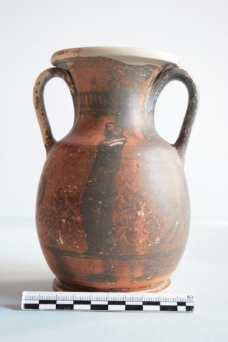 Pelike etrusca a decorazione sovrapposta in argilla giallina e vernice nera opaca, in più punti rossa per difetto di cottura. Il vaso è composto da: orlo rovesciato all'esterno, anse a nastro, piede ad anello con due scanalature orizzontali. Decorazione in rosso-vino sovrapposto: sul collo trattini verticali tra due linee orizzontali, sul corpo sotto le anse piccole palmette e ai lati motivo a girali e foglie; sui lati a)e b) figure ammantate volte a sinistra con particolari dei panneggi incisi; al di sotto della zona decorata vi sono sottili linee orizzontali. Il fondo è risparmiato e il colore sovrapposto è scomparso quasi del tutto, lasciando al suo posto la traccia scura a silhoutte delle figure e dei motivi decorativi. E' mancante di parte dell'orlo e vi sono delle profonde abrasioni che rendono illeggibile la decorazione di uno dei due lati. la pelike rientra nel gruppo del Fantasma.