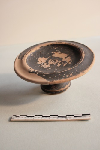 Piattino su piede a vernice nera opaca in argilla giallina. Il piattino è poco profondo e presenta un largo bordo concavo lievemente flesso verso il basso. Il profilo esterno a curva continua fino al breve bordino diritto del piede. Il fondo è leggermente cavo. A risparmio l'orlo del piede e la base d'appoggio. Sono presenti diffuse screpolature. Esemplari simili sono molto frequenti ad Adria tra il III e il II secolo a.C.