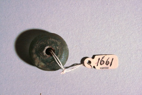 Perla color azzurro scuro di forma globulare schiacciata, databile genericamente all'età del ferro e di probabile provenienza dall'agro altinate.