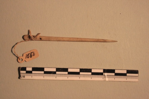 Ago in osso con cruna appiattita e vari fori rotondi o rettangolari. Si può ritenere pertinente a un corredo funerario femminile ed è datato genericamente all'età romana.