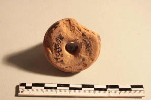 Fusarola in terracotta, utilizzata per appesantire i fusi (ma non è escluso anche un utilizzo come pesi da telaio o da rete).La forma molto semplice si mantenne per secoli, tanto che non è possibile una precisa attribuzione cronologica.