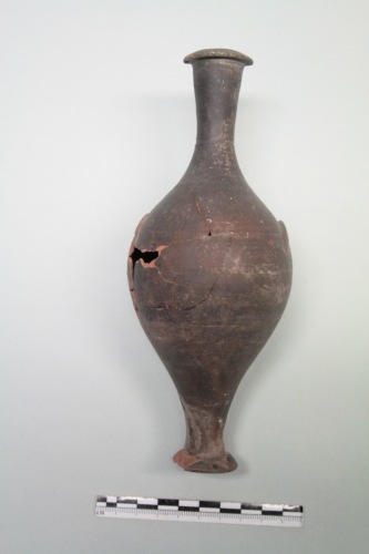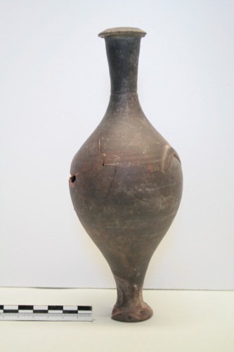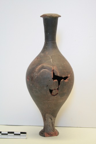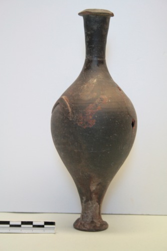 Unguentario fusiforme a vernice nera in argilla rosa scuro e vernice nera opaca tendente al bruno. Il corpo è ovoidale, il piede è ad orlo ribattuto e il collo ad orlo piatto, le anse sono triangolari e quasi aderenti al corpo. A risparmio: la parte inferiore del piede con sbavature di vernice. Ricomposto da più frammenti. L'unguentario fusiforme a vernice nera è abbastanza raro in ambiente estrusco, mentre sembra essere relativamente più frequente in Italia meridionale e viene datato tra la fine del III e la prima metà del II secolo a.C. Il profilo rientra nel tipo IV della Forti, mentre le anse così poco rilevate sembrano essere in questo caso unicamente un motivo ornamentale.