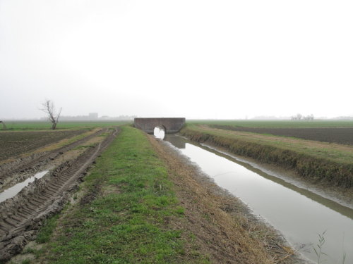 ponte in muratura continua a vista a canna ad arco a tutto sesto con parapetti pieni, pianta rettangolare con passaggio in terra.