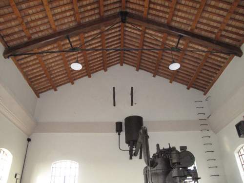 edificio a pianta rettangolare con torretta annessa, murature continue in laterizio a vista, forometria regolare e arcuata seriale, sottotetto con travi in legno con capriate reticolari in ferro a vista e copertura a capanna in coppi di laterizio.